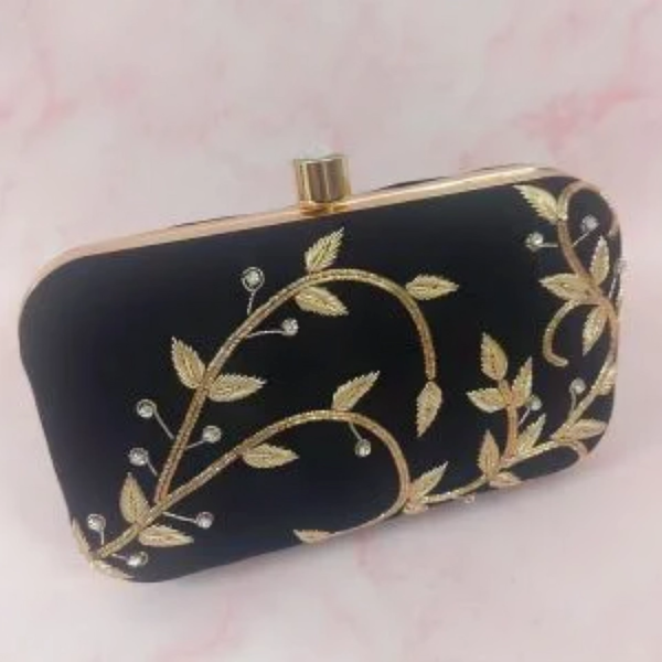 Black Embroidered Clutch Bag With Golden Work – Exquisite Bridal & Party Accessory