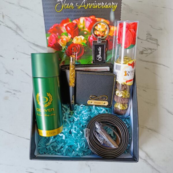 The Men’s Customized Gift Hamper includes a wallet, pen, SS keychain, leather belt, flower chocolate, Denver body spray, and a customizable greeting card. Perfect for birthdays, anniversaries, or corporate gifting, all items come packed in a stylish box.