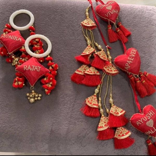 Elevate your bridal ensemble with our exquisite combo of Kalire and Lehenga tassel. Handcrafted to perfection, these traditional accessories add a touch of elegance and charm to your wedding attire. Available in a variety of colors, we offer customization options to match your dress perfectly. Shipping charges apply, and the making time is one week. Simply send us your dress color, and we'll create a personalized set that complements your bridal look beautifully.