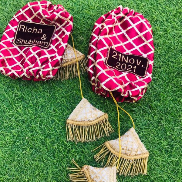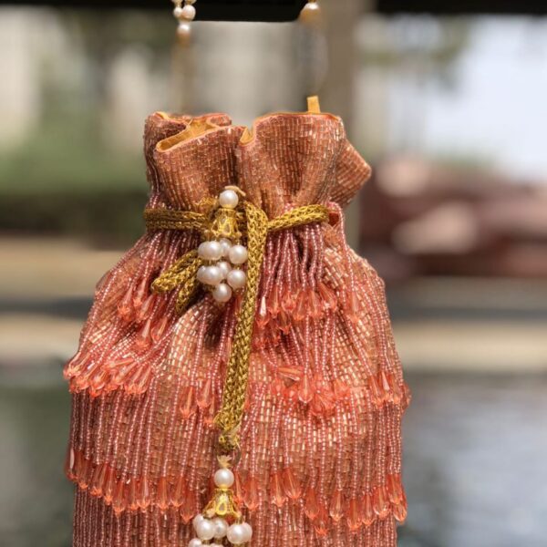 The secure drawstring closure ensures that your belongings stay safe while adding a chic finish, and the soft, easy-to-hold handle makes it comfortable to carry during long events. Ideal for weddings, festive celebrations, or any cultural occasion, this versatile potli is perfect for brides, bridesmaids, and guests who want to add an extra touch of sophistication to their traditional attire.