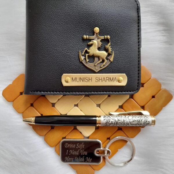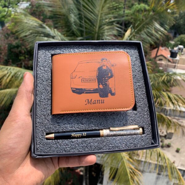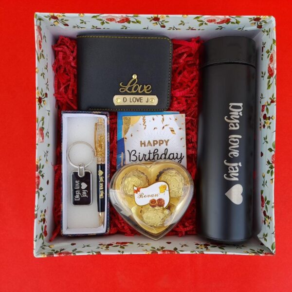The Customized Birthday Combo is the perfect blend of style, practicality, and luxury. Featuring a personalized leather wallet, gold flake pen & keyring, leather eyewear case, Fog bottle, temperature bottle, and a selection of chocolates, this gift set is a thoughtful and indulgent way to celebrate someone’s special day.