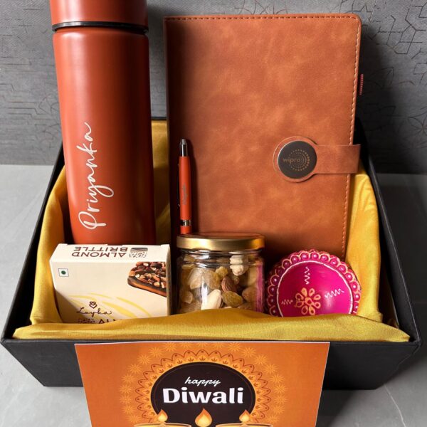 ₹1,450.00A premium customized Diwali gift hamper with company logo branding. Includes dry fruits, a bottle, almond brittle, and decorative diyas — perfect for corporate gifting.