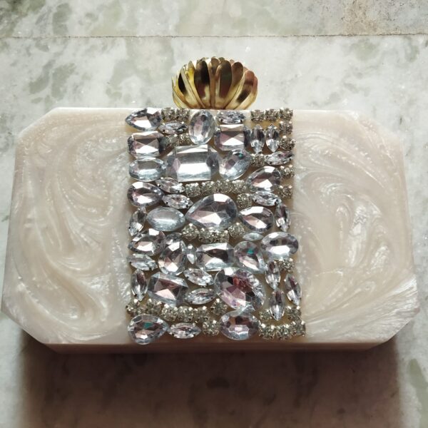 The resin made clutch is a perfect accessory for ladies in any function. Very well handcrafted & perfect color combination make it aust have item.