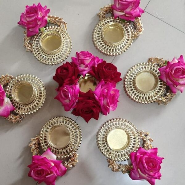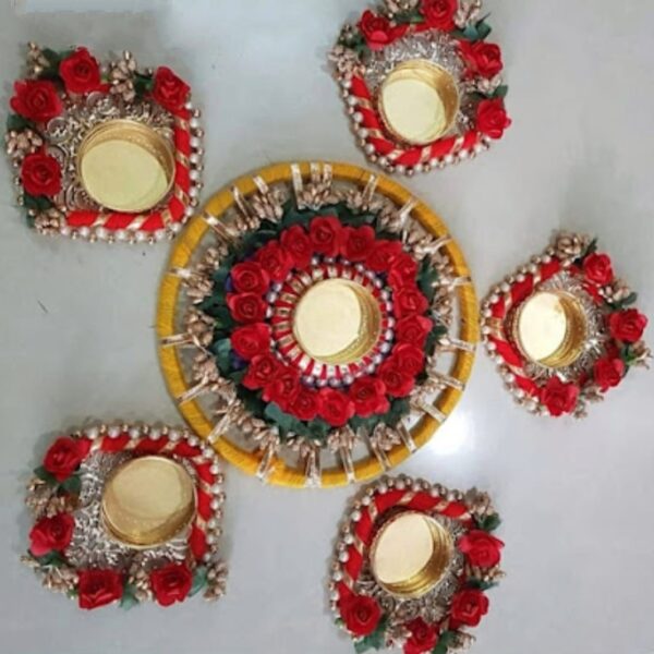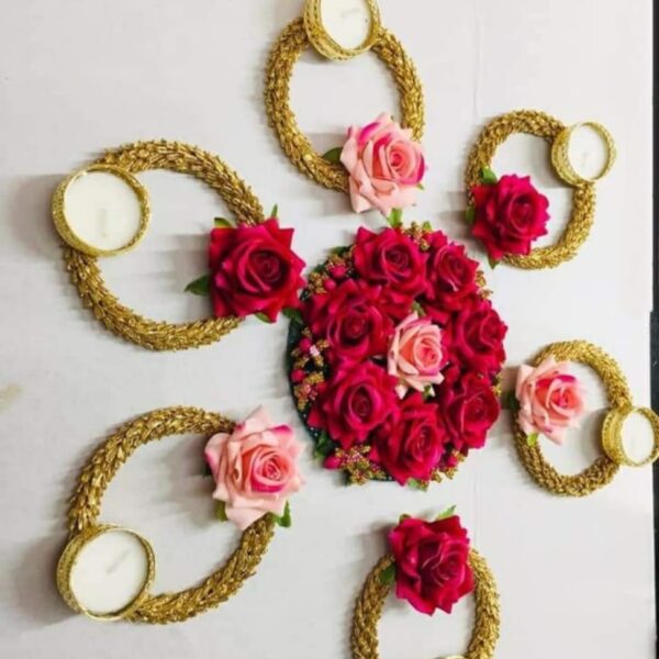 Brighten up your home this Diwali with this Set of 5 Tealight Candle Holder Diya Rangoli. Perfect for mandir decoration, home decor, or as a centerpiece for festive occasions, this vibrant rangoli set adds a traditional touch to your space. Ideal for Diwali, weddings, and pooja room decor.