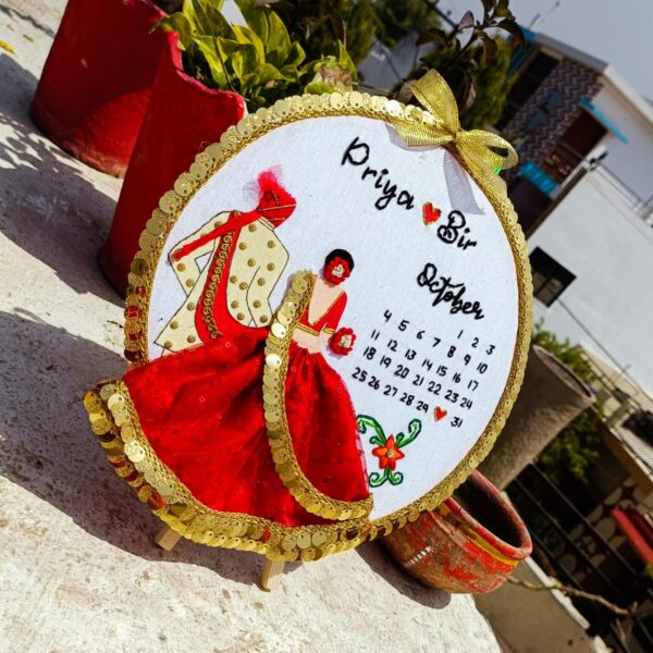 Make any dates memorable with these pretty embroidered Bride & Groom Calendar wall hanging. You can customize the couple's name and date on it and gift that is an expression of your affection to your loved one in a unique way for an anniversary or wedding gift. The red lehenga & the shade of red colored tassels complement the calendar hoop perfectly. Due to the handmade nature of this item, design may vary slightly.