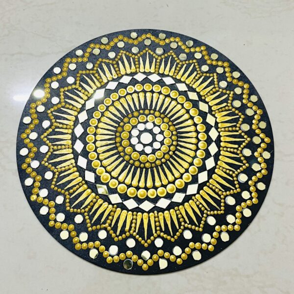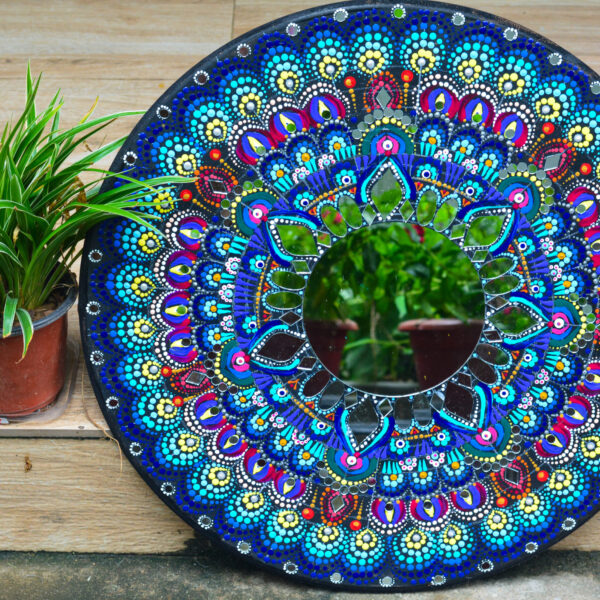 This is a 20" round mandala art with mirror work done. It can be mounted on the wall or can be kept on any platform.