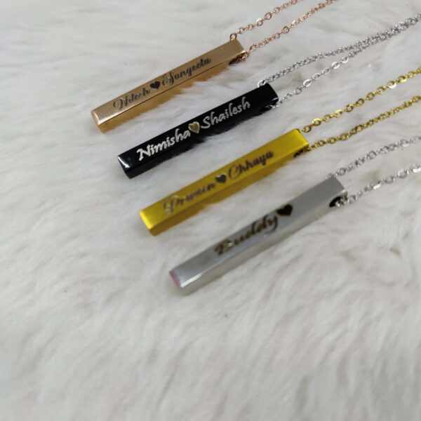 Elevate your style with our Customized 2D Bar Name Pendant. Available in Golden and Silver finishes, this sleek pendant is crafted from high-quality stainless steel and comes with a lifelong polish guarantee.