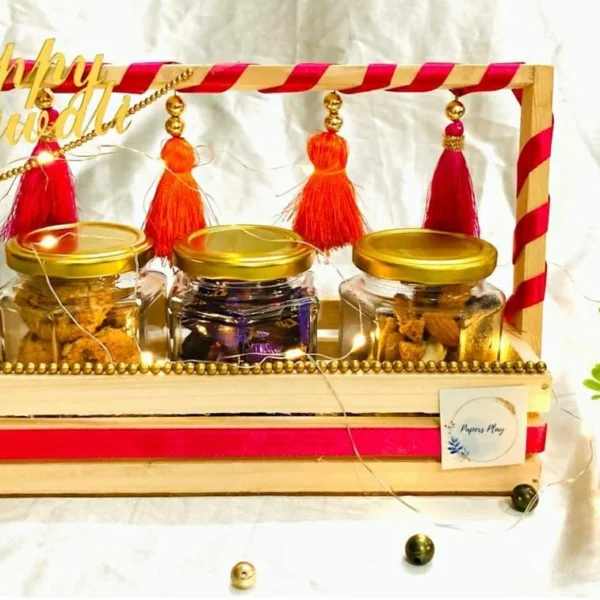 Indulge in the luxury of our Wooden Theme Elegantly Wrapped Assorted Dry Fruit Hamper. This beautifully packaged set includes three premium jars filled with dry fruits, chocolates, and cookies—perfect for gifting or savoring on special occasions.