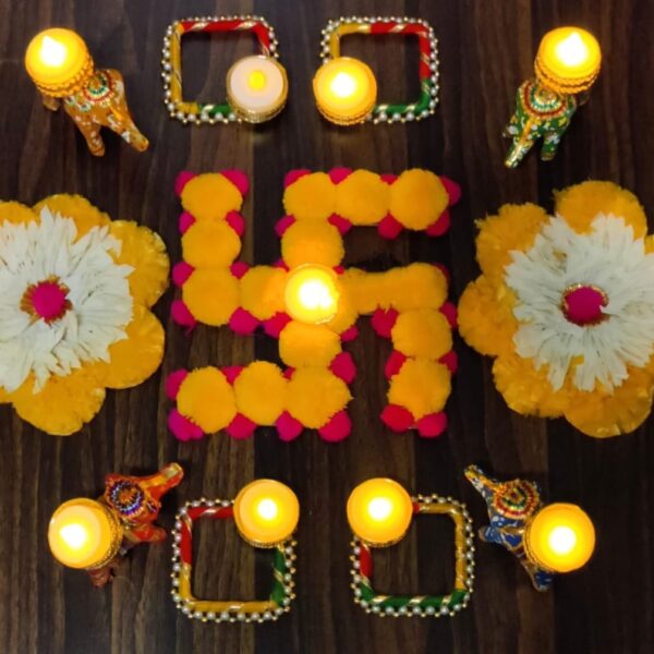 Illuminate your home this Diwali with the Swastika Mat with Tealight Holder Combo. This handcrafted set features a Swastika mat adorned with artificial flowers, 2 rangoli mats, and a selection of t-light holders. Choose between wax or LED diyas for the perfect festive glow. Available in vibrant colors, this combo is ideal for Diwali decoration or as a thoughtful gift.