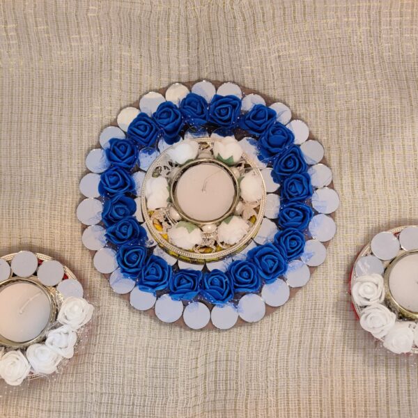 Enhance your Diwali and festive décor with our Handcrafted Triplet Candle Set, featuring elegant mirror and floral detailing. Designed for special Poojan decorations, this set adds a personalized touch to your home. Ideal for gifting or enhancing your Diwali celebrations, it offers both beauty and spiritual warmth.