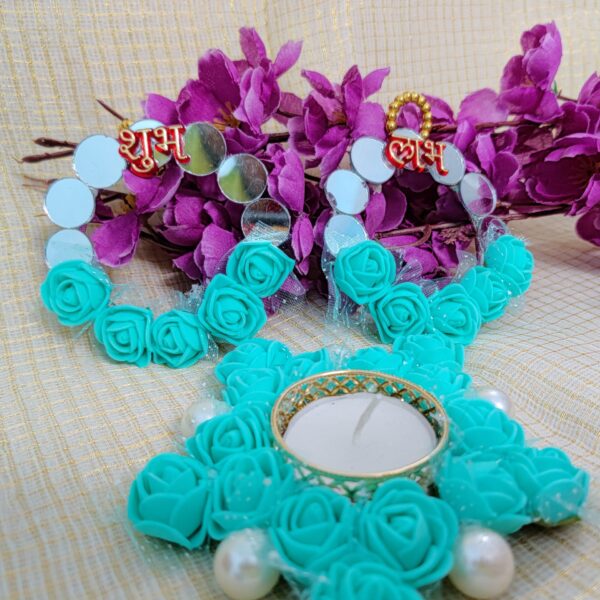 Handcrafted Triplet Candle Set with Mirror & Floral Work – Customized Diwali Special Poojan Decor