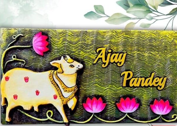 Pichwai Cow Wooden Home Door Nameplate – Custom Handcrafted Entrance Plate