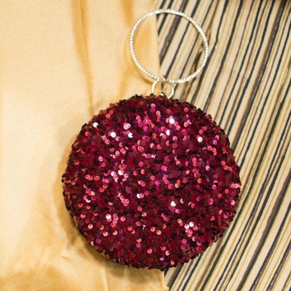 Elegant Red Sequin Embroidered Round Clutch with Sling Chain & Hand Ring