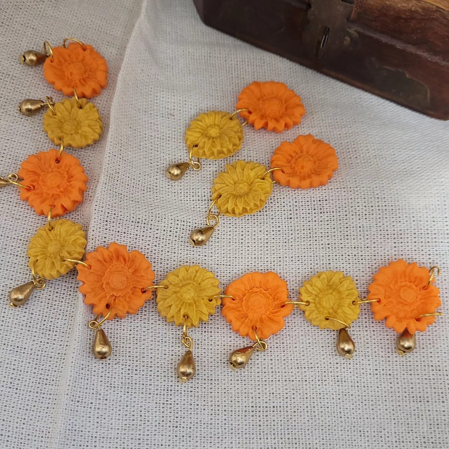 Adorn yourself with our Golden and Orange Floral Necklace Set. Its intricate floral design in radiant hues adds a touch of sophistication to any ensemble.