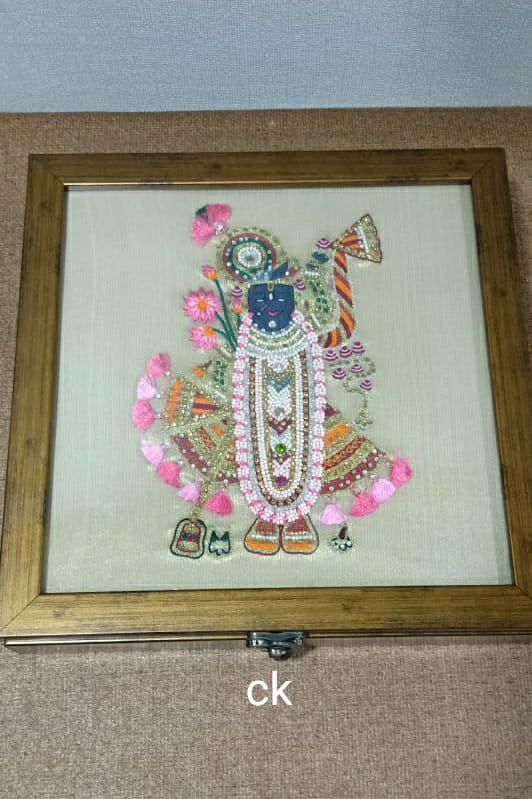 Our exclusive Shrinathji hand-embroidered box is a stunning fusion of art and spirituality, crafted with meticulous detail to bring a divine presence into your space. Each box is custom-made to order, featuring intricate hand-embroidery that beautifully captures the essence of Shrinathji. Perfect for storing precious keepsakes or religious artifacts, this elegant piece combines functionality with spiritual reverence. The box is designed to serve both as a decorative accent and a meaningful storage solution, adding a touch of sacred beauty to any room.
