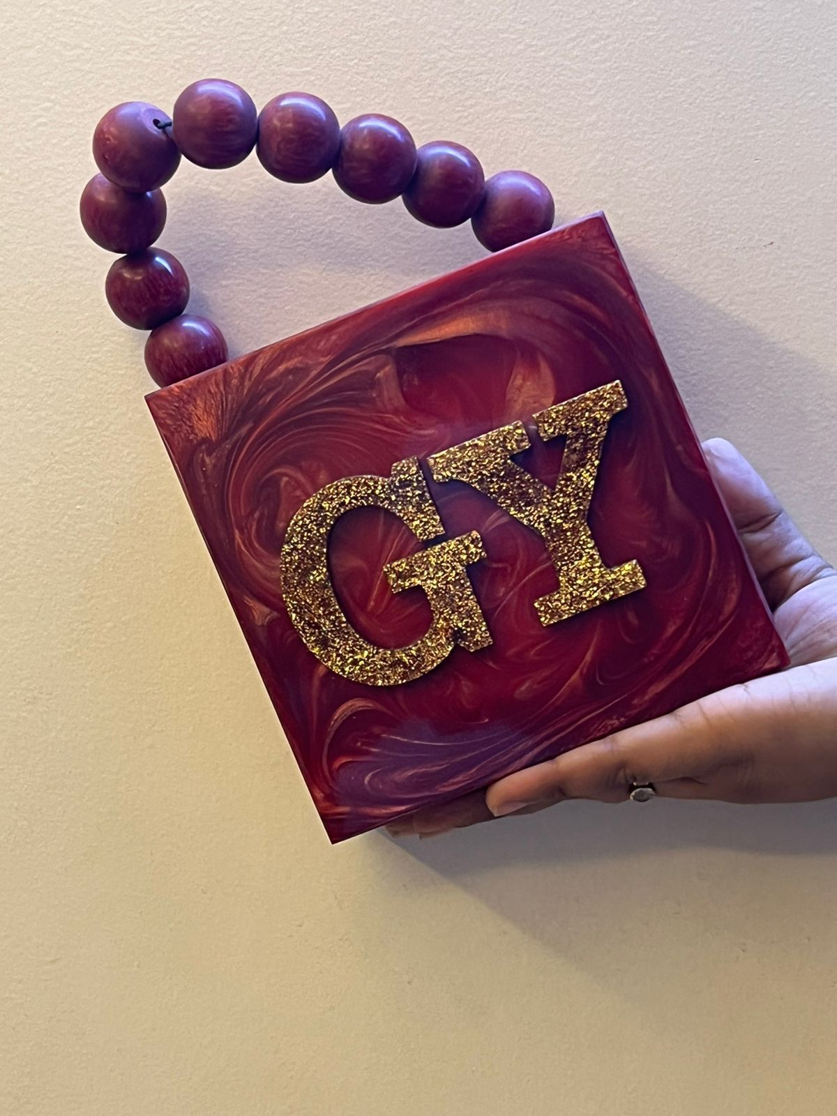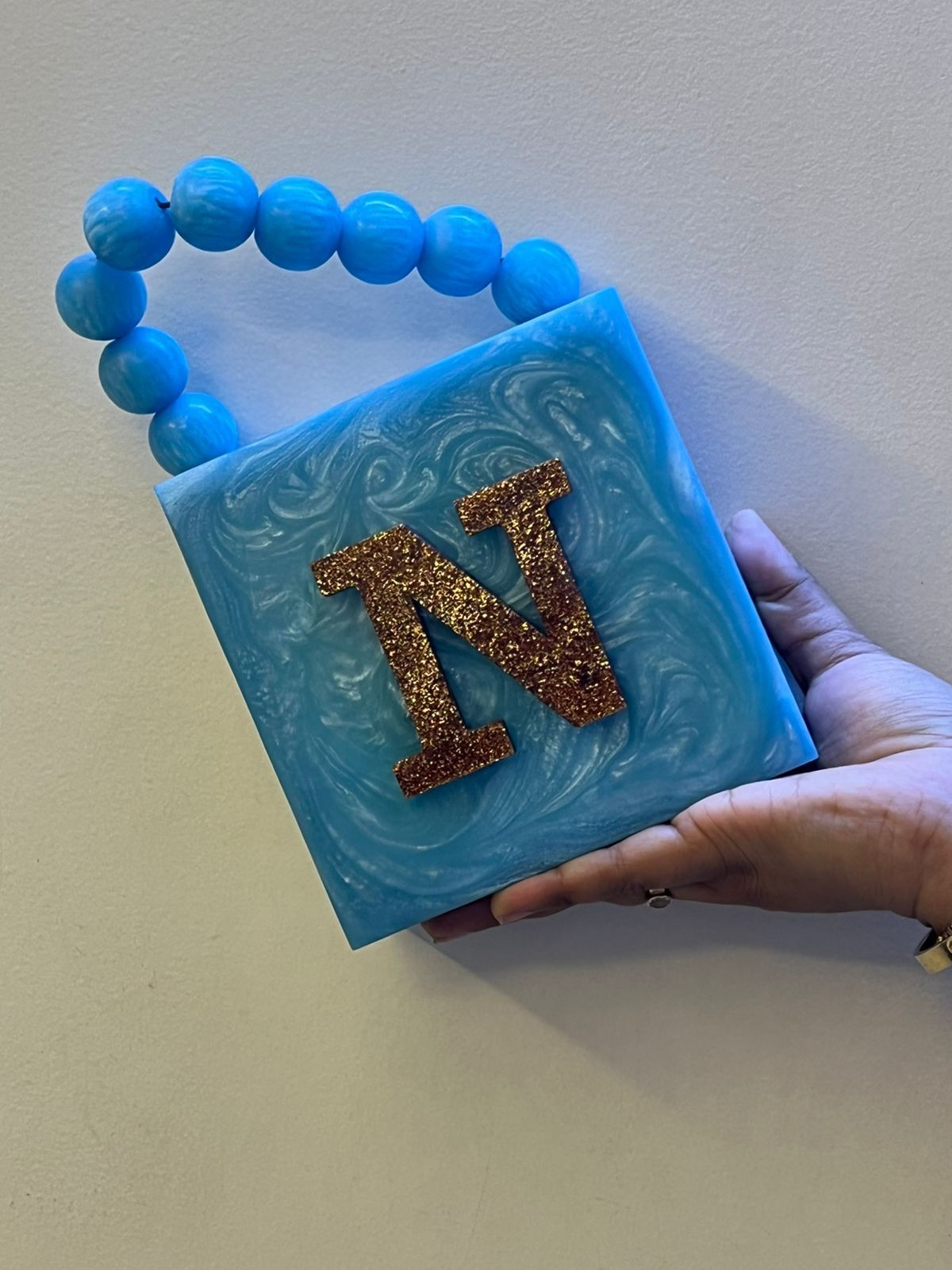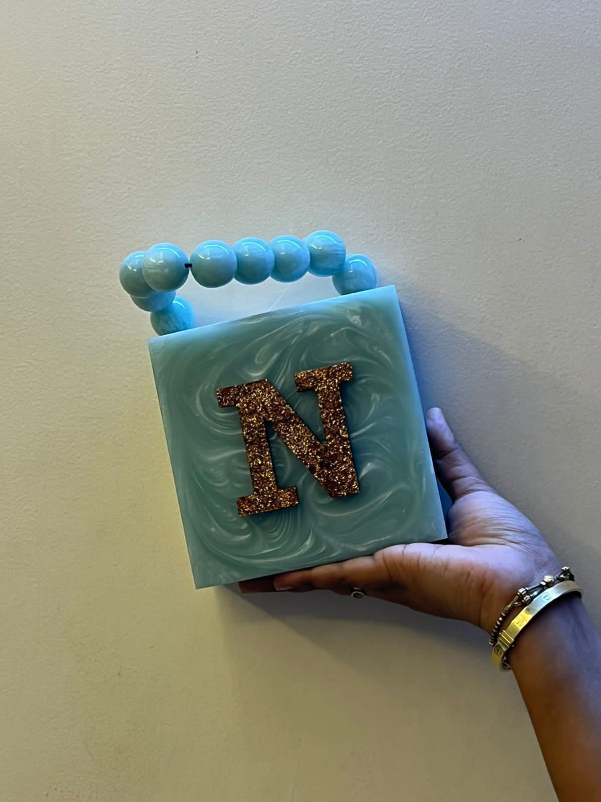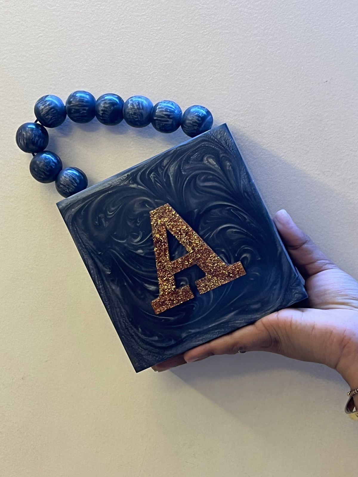 Introducing our exquisite Mini Resin Clutch, featuring a captivating new design and luxurious golden glitter finish. With customization options available, this compact clutch adds a touch of glamour to any ensemble. Get yours now!