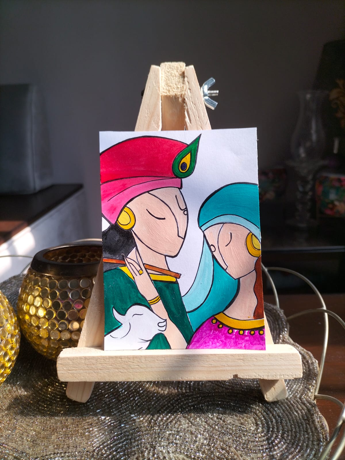 Radha Krishna Painted canvas with wooden easel