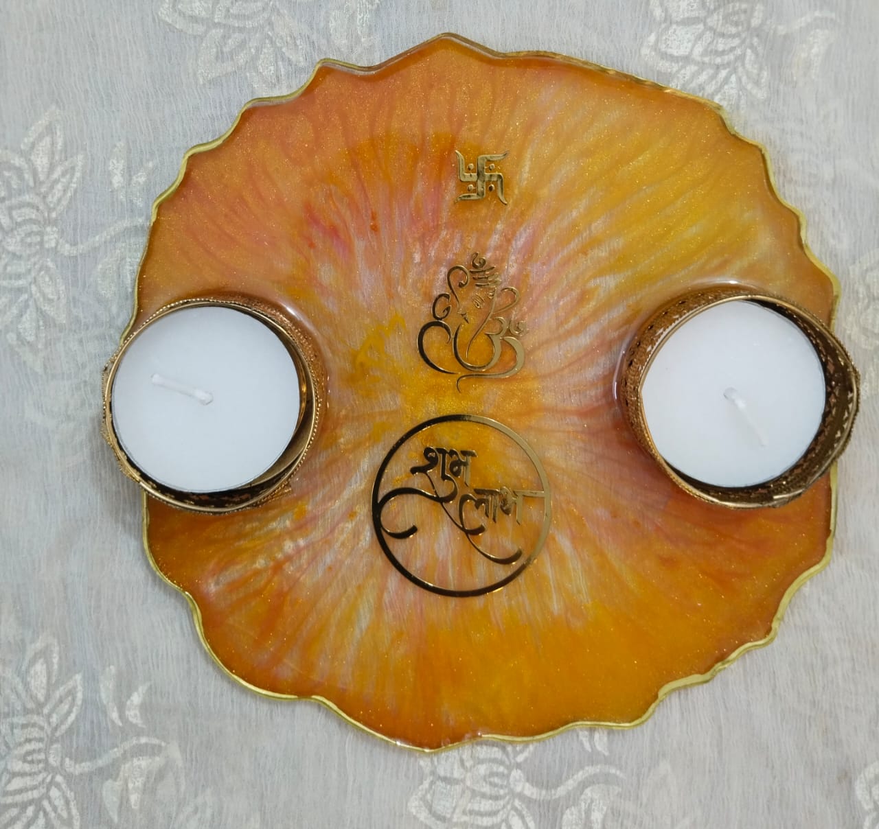 This Subh Labh Resin Thali with T-Light Holder combines functionality with elegance, making it an essential accessory for enhancing your spiritual rituals and creating a sacred atmosphere in your home